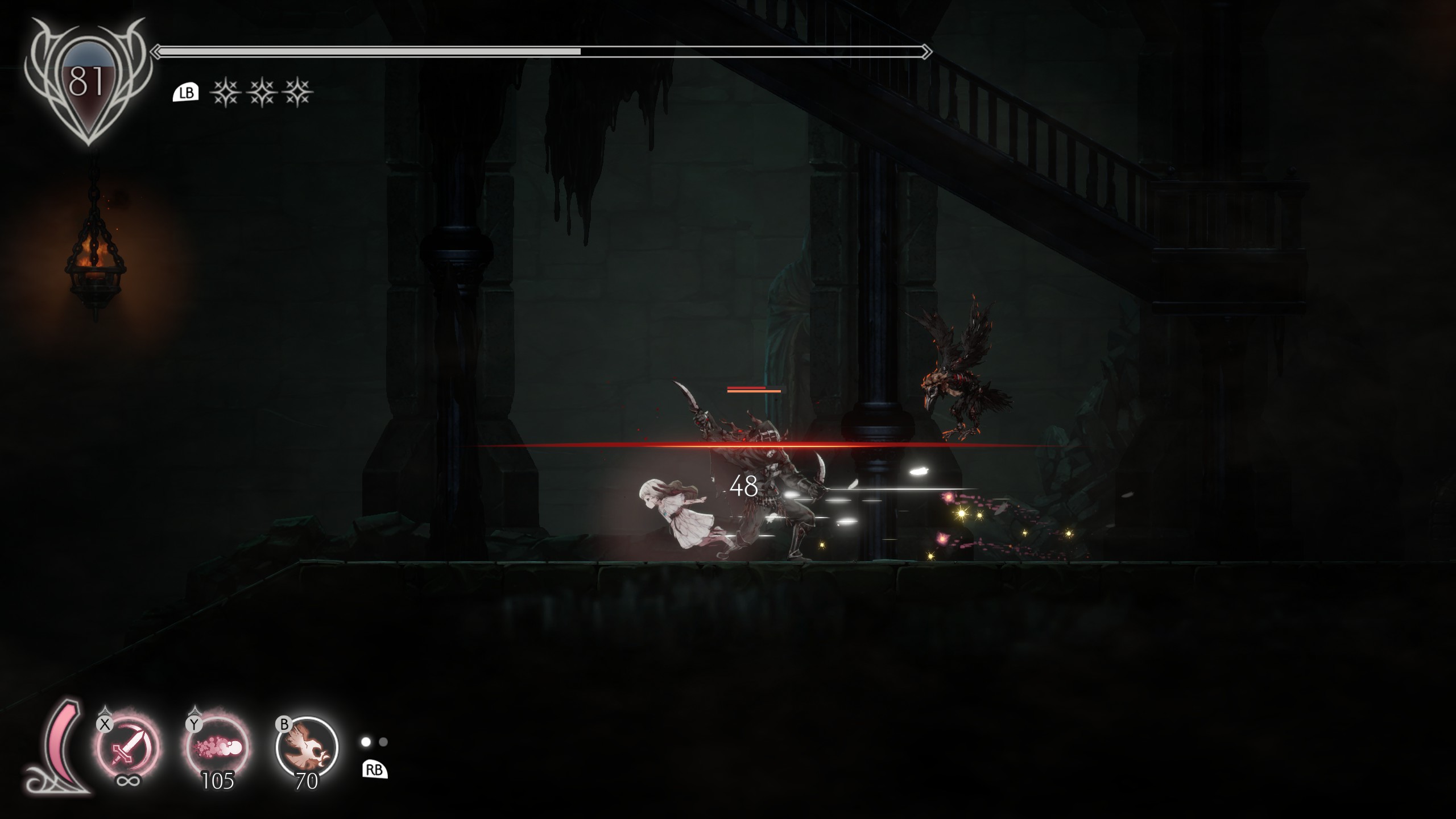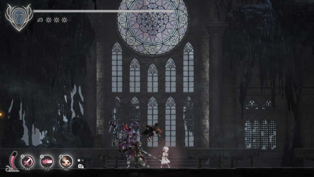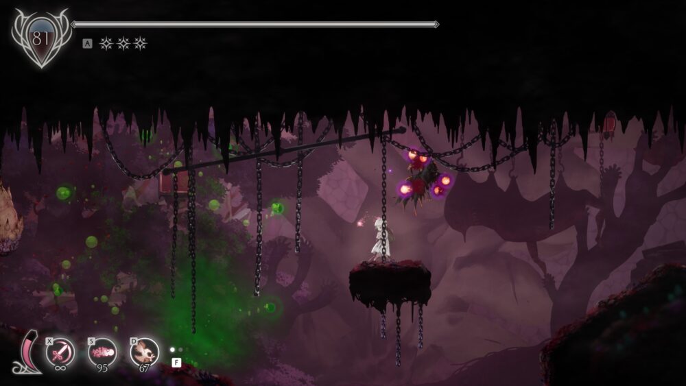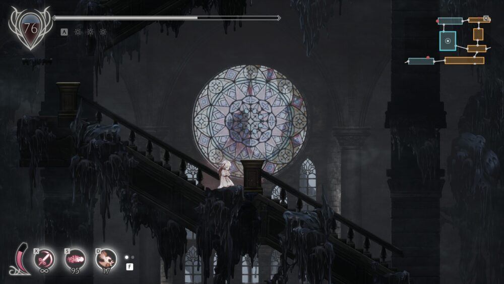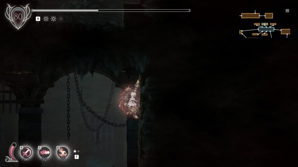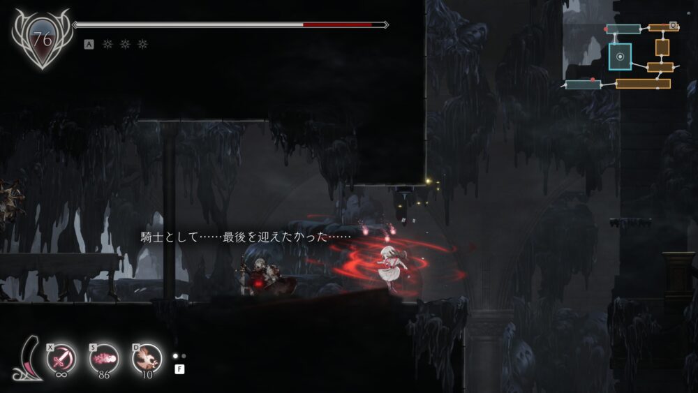ステージのところどころに、狂い騎士の血爪で壁に張り付いてから、逆を向いてジャンプ→さらに上の壁に張り付かなければ先に進めない箇所があります。