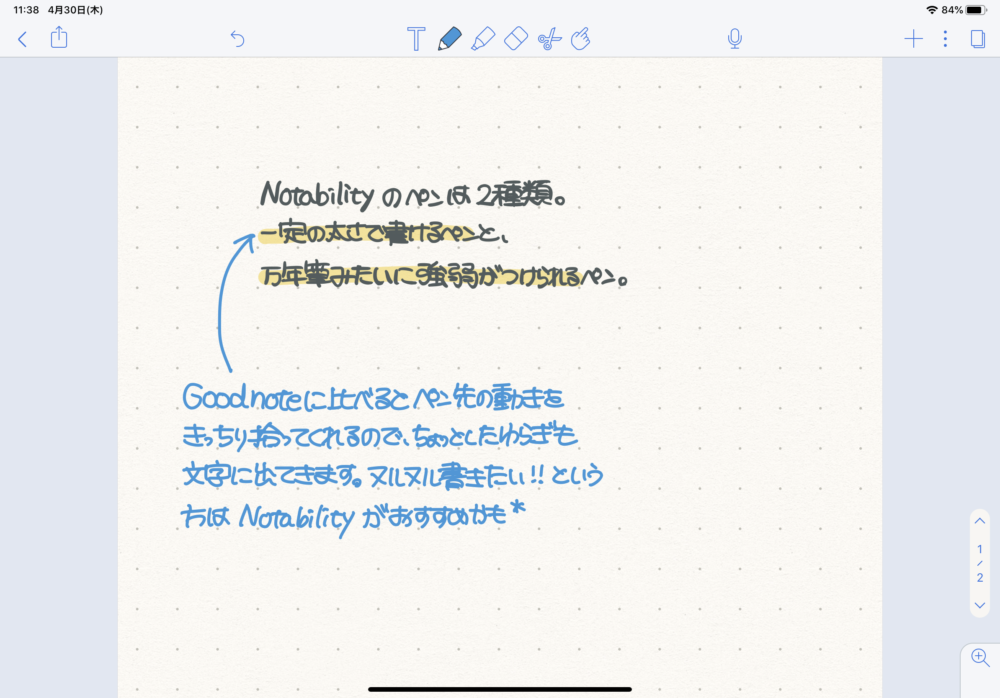 Notabilityの書き味はまさに万年筆。反応の良さが魅力です。Goodnote5は印象的には油性ボールペンに近い書き味です。
